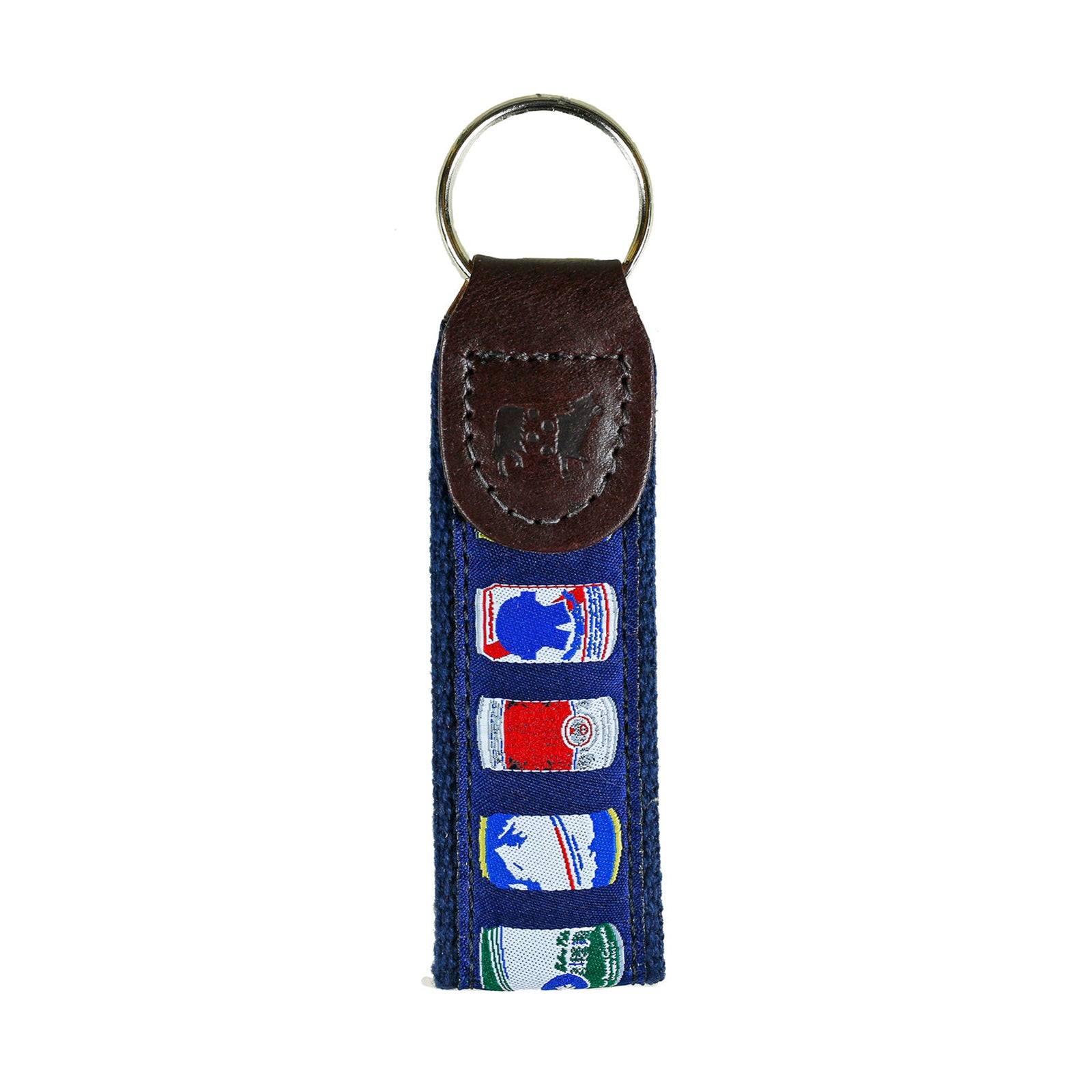 The Belted Cow Key Fob features sturdy 1 1/4” cotton webbing with nickel key rings attached with tips cut from Italian leather. Proudly made in Maine.