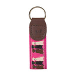 The Belted Cow Key Fob features sturdy 1 1/4” cotton webbing with nickel key rings attached with tips cut from Italian leather. Proudly made in Maine.