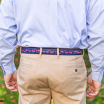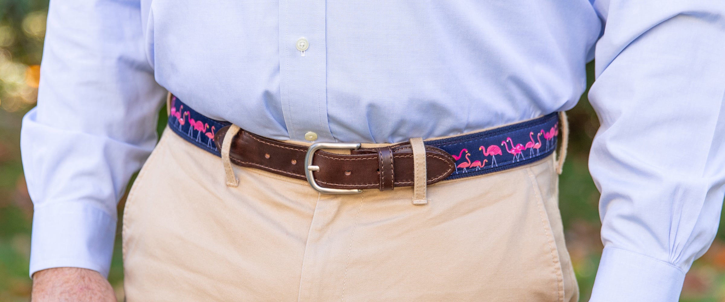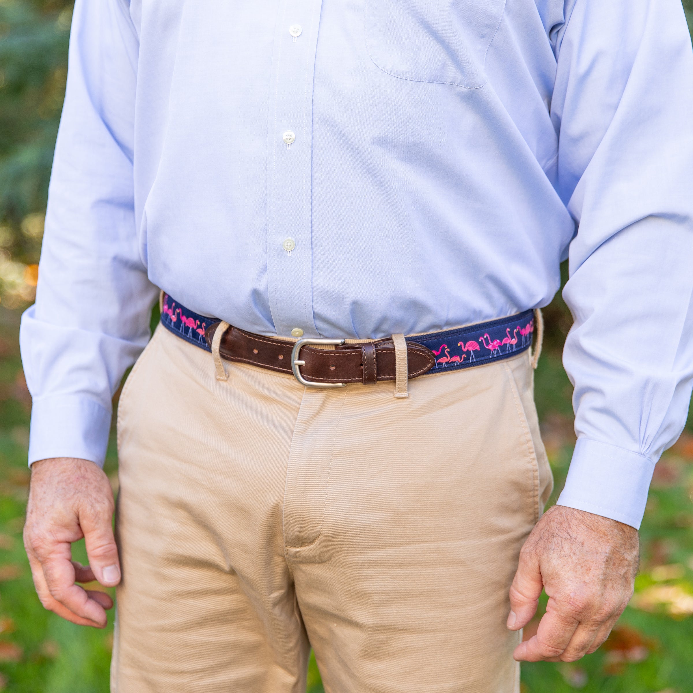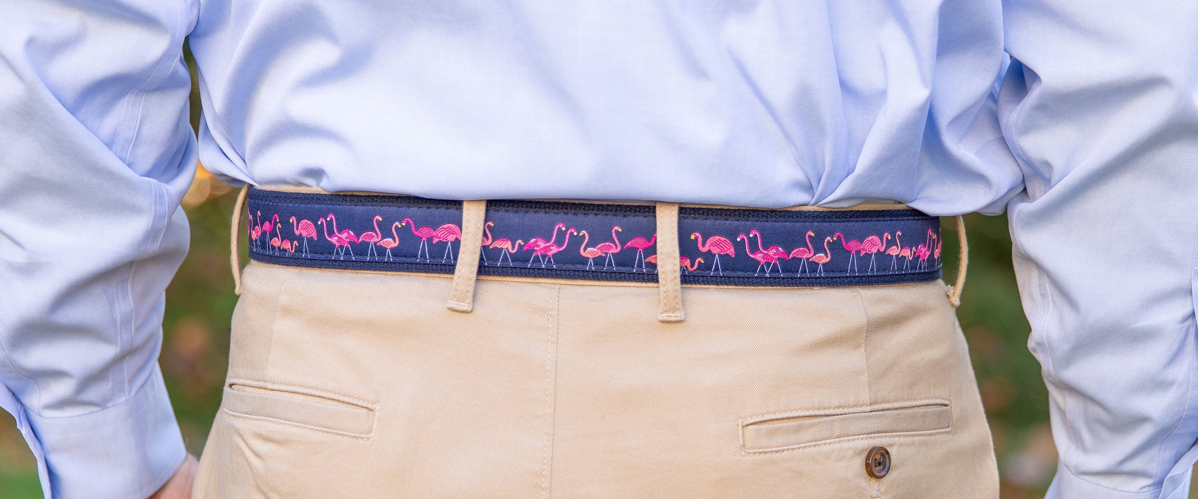 Make heads turn with the Yard Flamingos club belt! This charming accessory features a conga line of sassy flamingos doing the cha-cha across the background, bringing a splash of tropical paradise to your wardrobe. Whether you're jazzing up your outfit for a casual day out or adding some pizzazz to your everyday style, this belt is guaranteed to make people wonder if you moonlight as a professional party starter.